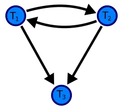 Un graphe de précédence du programme D, avec 3 transactions. Comme il existe un cycle (de longueur 2 ; avec deux arêtes) à travers les transactions validées T1 et T2, cette planification (historique) n'est pas Conflict serializable (en). Notez que le commit de la transaction 2 n'a aucune signification concernant la création d'un graphe de priorité.