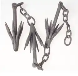 - une arme de marine, une ancre pourvue de quatre à six crocs au bout d'une longue corde (lors d'un combat naval rapproché, les marins jetaient les grappins vers le navire ennemi en essayant de les fixer aux étais, au bastingage ou aux gréements[1]. Puis ils tiraient de toutes leurs forces[réf. nécessaire] afin d'amener les deux navires côte à côte et de passer sur le navire ennemi) ; actuellement les mêmes grappins portent également le nom de drague et sont utilisés pour agripper et sortir des poissons ou des objets de l'eau, notamment par les pêcheurs de morue sur les bancs de Terre-Neuve.