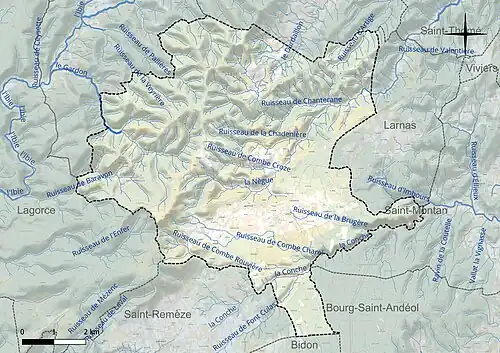 Les communes limitrophes sont Bidon, Bourg-Saint-Andéol, Lagorce, Larnas, Saint-Maurice-d'Ibie, Saint-Montan, Saint-Remèze et Valvignères.