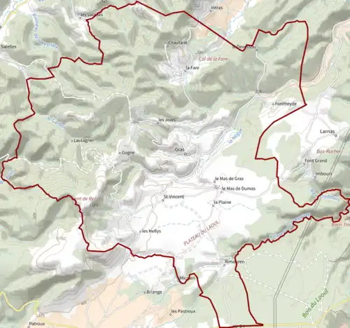 La commune, proche de la vallée du Rhône, n'est pas situé dans le plateau des Gras comme son nom le laisserait penser, mais sur le plateau du Laoul, au pied de la Dent de Rez, qui est le massif culminant de la Basse Ardèche avec ses 719 m.