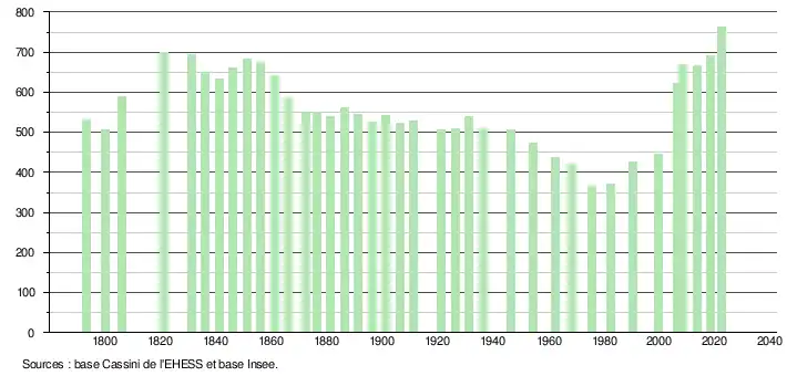 | L'évolution du nombre d'habitants est connue à travers les recensements de la population effectués dans la commune depuis 1793. Pour les communes de moins de 10 000 habitants, une enquête de recensement portant sur toute la population est réalisée tous les cinq ans, les populations de référence des années intermédiaires étant quant à elles estimées par interpolation ou extrapolation[25]. Pour la commune, le premier recensement exhaustif entrant dans le cadre du nouveau dispositif a été réalisé en 2008[26]. En 2022, la commune comptait 763 habitants[Note 5], en évolution de +12,87 % par rapport à 2016 (Haute-Garonne : +8,02 %, France hors Mayotte : +2,11 %). |