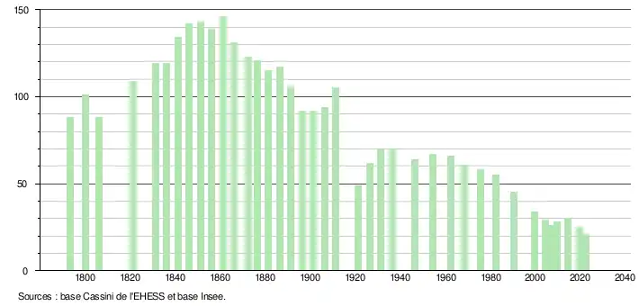 L'évolution du nombre d'habitants est connue à travers les recensements de la population effectués dans la commune depuis 1793. Pour les communes de moins de 10 000 habitants, une enquête de recensement portant sur toute la population est réalisée tous les cinq ans, les populations de référence des années intermédiaires étant quant à elles estimées par interpolation ou extrapolation[20]. Pour la commune, le premier recensement exhaustif entrant dans le cadre du nouveau dispositif a été réalisé en 2004[21].
