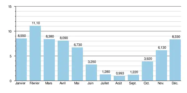 Le débit instantané maximal sur la période d'observation a été de 322,0 m3/s le , en même temps que la hauteur maximale instantanée de 791 cm ou 7,91 m, et le débit journalier maximal de 174 m3/s[2].