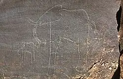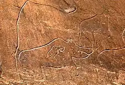 D'autres gravures représentent un bovidé, un rhinocéros, une antilope, un fauve, une autruche.