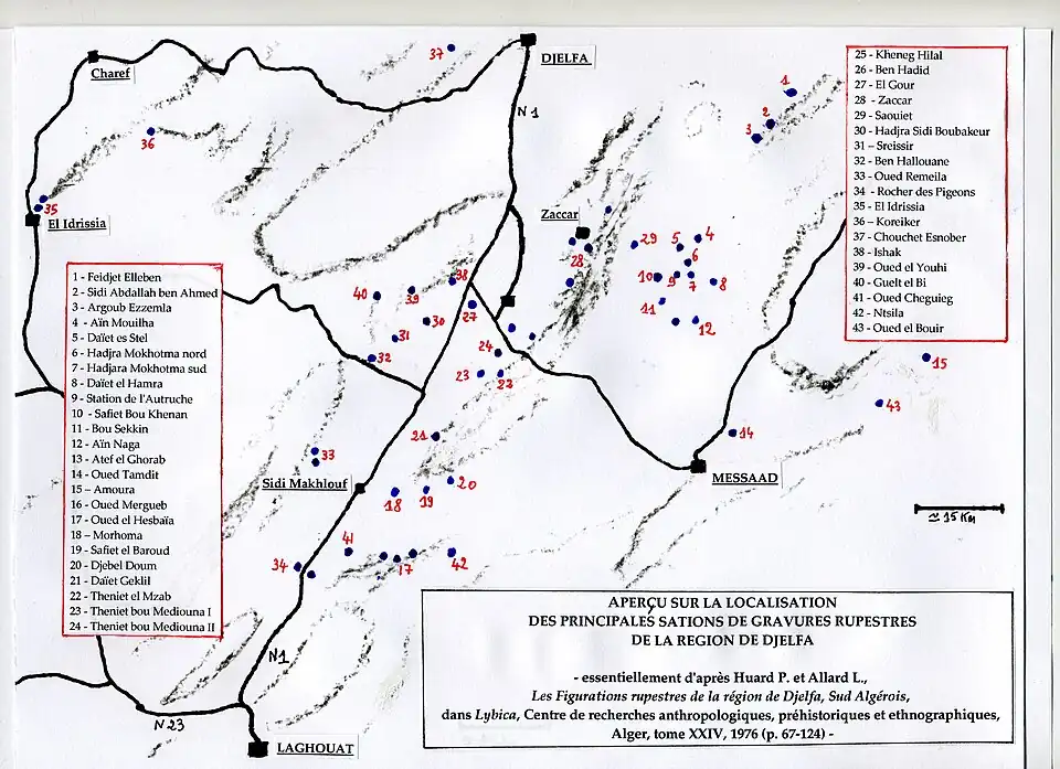 Regrettant « la méconnaissance de l'importance des rupestres du Sud Algérois » dans l'ouvrage de Lhote, P. Huard et L. Allard publient en 1976 dans Lybica (CRAPE, Alger) une importante étude sur Les figurations rupestres de la région de Djelfa, Sud Algérois. Les auteurs y recensent en les numérotant quarante-trois stations qui sont à quelques exceptions près situées à l'intérieur ou sur les bords d'un triangle formé au nord par la ville de Djelfa, au sud-ouest par le village de Sidi Makhlouf et au sud-est par la ville de Messaad.