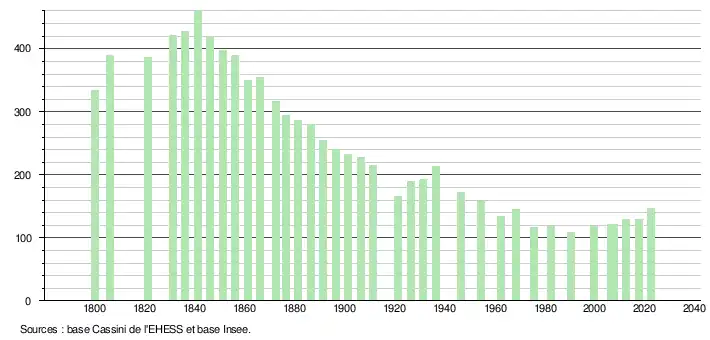L'évolution du nombre d'habitants est connue à travers les recensements de la population effectués dans la commune depuis 1800. Pour les communes de moins de 10 000 habitants, une enquête de recensement portant sur toute la population est réalisée tous les cinq ans, les populations de référence des années intermédiaires étant quant à elles estimées par interpolation ou extrapolation[23]. Pour la commune, le premier recensement exhaustif entrant dans le cadre du nouveau dispositif a été réalisé en 2007[24].
