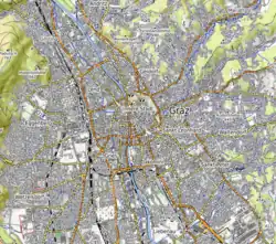 Le centre historique de Graz ; à droite la rivière Mur et l’ellipse verte de la colline Schlossberg, à gauche la végétation du Stadtpark (parc municipal). | |