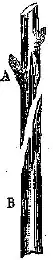 Cette greffe est très solide ; elle s'emploie chaque fois que le greffon et le porte-greffe sont de même diamètre (taille 8 mm environ). Le greffon A et le porte-greffe B sont taillés l'un et l'autre en biais allongé de façon à avoir une coupe longue d'environ deux à trois fois le diamètre du greffon. Le scion sera coupé en biais juste derrière un œil en laissant un peu d'espace en dessous pour pouvoir ligaturer la greffe. L'œil ainsi positionné juste au-dessus du point de greffe jouera un rôle de tire-sève.