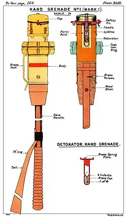 Durant la Première Guerre mondiale (1914-1918), la Triple-Entente et la Triple-Alliance n'avaient que de faibles stocks de grenades. Les troupes avaient donc temporairement improvisé des grenades, comme la Jam Tin Grenade (en) (une simple boîte de conserve remplie de poudre et dotée d'une mèche), ou des bâtonnets d'explosifs attachés à des manches en bois (pour augmenter la portée du jet). Elles furent remplacées lorsque des versions manufacturées virent le jour, comme la Mills Bomb britannique, la première grenade à fragmentation moderne.