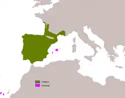 Cette espèce se rencontre du niveau de la mer jusqu'à 2 380 m d'altitude dans toute la péninsule Ibérique (Portugal et Espagne) et au-delà des Pyrénées en France vers le nord-ouest, dans une bande longeant l'Atlantique jusqu'en Vendée et vers le sud-est le long de la Méditerranée jusque dans le Gard.
