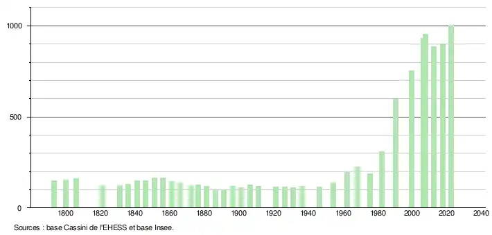 L'évolution du nombre d'habitants est connue à travers les recensements de la population effectués dans la commune depuis 1793. Pour les communes de moins de 10 000 habitants, une enquête de recensement portant sur toute la population est réalisée tous les cinq ans, les populations de référence des années intermédiaires étant quant à elles estimées par interpolation ou extrapolation[19]. Pour la commune, le premier recensement exhaustif entrant dans le cadre du nouveau dispositif a été réalisé en 2007[20].