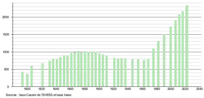 L'évolution du nombre d'habitants est connue à travers les recensements de la population effectués dans la commune depuis 1793. Pour les communes de moins de 10 000 habitants, une enquête de recensement portant sur toute la population est réalisée tous les cinq ans, les populations de référence des années intermédiaires étant quant à elles estimées par interpolation ou extrapolation[21]. Pour la commune, le premier recensement exhaustif entrant dans le cadre du nouveau dispositif a été réalisé en 2006[22].