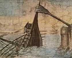 Il y avait encore des machines contre les assaillants qui, à l'abri de mantelets, étaient garantis de tout dommage provenant des projectiles tirés à travers le mur ; ces machines lâchaient contre eux des pierres capables de faire évacuer la proue par les combattants, et en même temps elles faisaient descendre un grappin de fer attaché à une chaîne. Par ce moyen l'homme qui dirigeait le mâtereau effectuait une prise de façon à saisir le navire par la proue, puis il faisait descendre le talon de sa machine à l'intérieur du rempart. Une fois qu'en soulevant la proue il avait dressé le navire sur sa poupe, il attachait les talons de ses engins à un point fixe puis, au moyen d'une détente, déclenchait la chaîne et le grappin. Quand cela se produisait, certains bateaux tombaient sur le côté, d'autres même se retournaient, la plupart plongeaient dans l'eau quand leur proue était ainsi précipitée de haut, et ils se remplissaient d'eau et de désordre. Polybe, VIII, 6 (traduction Raymond Weil)