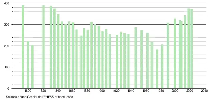 L'évolution du nombre d'habitants est connue à travers les recensements de la population effectués dans la commune depuis 1793. Pour les communes de moins de 10 000 habitants, une enquête de recensement portant sur toute la population est réalisée tous les cinq ans, les populations de référence des années intermédiaires étant quant à elles estimées par interpolation ou extrapolation[25]. Pour la commune, le premier recensement exhaustif entrant dans le cadre du nouveau dispositif a été réalisé en 2008[26].