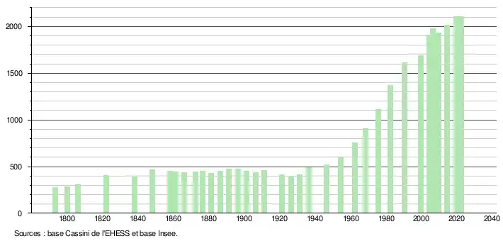 L'évolution du nombre d'habitants est connue à travers les recensements de la population effectués dans la commune depuis 1793. Pour les communes de moins de 10 000 habitants, une enquête de recensement portant sur toute la population est réalisée tous les cinq ans, les populations de référence des années intermédiaires étant quant à elles estimées par interpolation ou extrapolation[20]. Pour la commune, le premier recensement exhaustif entrant dans le cadre du nouveau dispositif a été réalisé en 2004[21].