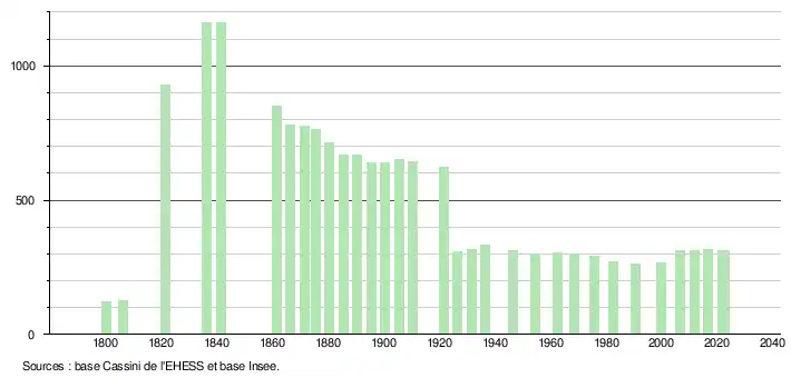 L'évolution du nombre d'habitants est connue à travers les recensements de la population effectués dans la commune depuis 1800. Pour les communes de moins de 10 000 habitants, une enquête de recensement portant sur toute la population est réalisée tous les cinq ans, les populations de référence des années intermédiaires étant quant à elles estimées par interpolation ou extrapolation[16]. Pour la commune, le premier recensement exhaustif entrant dans le cadre du nouveau dispositif a été réalisé en 2006[17].