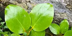 Griselinia littoralis est un arbuste ou un petit arbre rustique à feuilles persistantes qui peut atteindre 10 m ou plus de 15 m de haut[2]. Griselinia littoralis a une forme ronde et un feuillage dense. Il possède des branches courtes et rugueuses qui peuvent atteindre 150 cm de diamètre. Les feuilles jaune-vert sont épaisses et leurs largeurs peuvent être de 5-12 cm de long sur 4-5 cm de large. La forme de la feuille apicale est large-ovale à ovale-oblongue ou arrondie avec une marge lisse[3]. Les feuilles sont alternes, coriaces, jaune-vert brillant et de 6-14 cm de long, ovales avec une marge lisse.