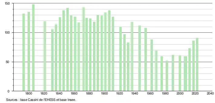 L'évolution du nombre d'habitants est connue à travers les recensements de la population effectués dans la commune depuis 1793. Pour les communes de moins de 10 000 habitants, une enquête de recensement portant sur toute la population est réalisée tous les cinq ans, les populations de référence des années intermédiaires étant quant à elles estimées par interpolation ou extrapolation[20]. Pour la commune, le premier recensement exhaustif entrant dans le cadre du nouveau dispositif a été réalisé en 2007[21].
