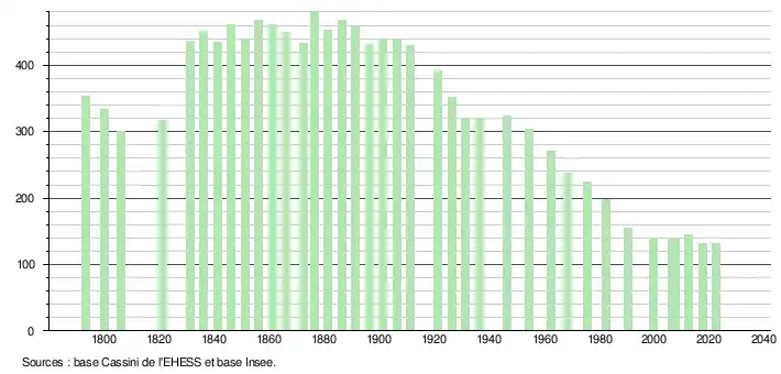L'évolution du nombre d'habitants est connue à travers les recensements de la population effectués dans la commune depuis 1793. Pour les communes de moins de 10 000 habitants, une enquête de recensement portant sur toute la population est réalisée tous les cinq ans, les populations de référence des années intermédiaires étant quant à elles estimées par interpolation ou extrapolation[18]. Pour la commune, le premier recensement exhaustif entrant dans le cadre du nouveau dispositif a été réalisé en 2007[19].