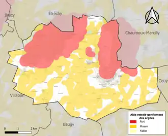 La commune est vulnérable au risque de mouvements de terrains constitué principalement du retrait-gonflement des sols argileux[14]. Cet aléa est susceptible d'engendrer des dommages importants aux bâtiments en cas d’alternance de périodes de sécheresse et de pluie. 79,3 % de la superficie communale est en aléa moyen ou fort (90 % au niveau départemental et 48,5 % au niveau national). Sur les 274 bâtiments dénombrés sur la commune en 2019, 123 sont en aléa moyen ou fort, soit 45 %, à comparer aux 83 % au niveau départemental et 54 % au niveau national. Une cartographie de l'exposition du territoire national au retrait gonflement des sols argileux est disponible sur le site du BRGM[15],[Carte 2].