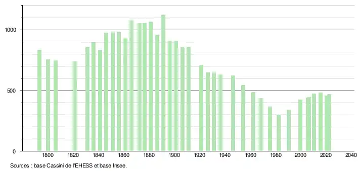 L'évolution du nombre d'habitants est connue à travers les recensements de la population effectués dans la commune depuis 1793. Pour les communes de moins de 10 000 habitants, une enquête de recensement portant sur toute la population est réalisée tous les cinq ans, les populations de référence des années intermédiaires étant quant à elles estimées par interpolation ou extrapolation[19]. Pour la commune, le premier recensement exhaustif entrant dans le cadre du nouveau dispositif a été réalisé en 2005[20].