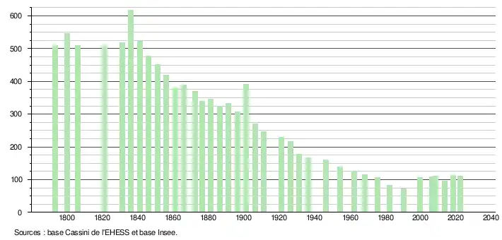 L'évolution du nombre d'habitants est connue à travers les recensements de la population effectués dans la commune depuis 1793. Pour les communes de moins de 10 000 habitants, une enquête de recensement portant sur toute la population est réalisée tous les cinq ans, les populations de référence des années intermédiaires étant quant à elles estimées par interpolation ou extrapolation[13]. Pour la commune, le premier recensement exhaustif entrant dans le cadre du nouveau dispositif a été réalisé en 2008[14].