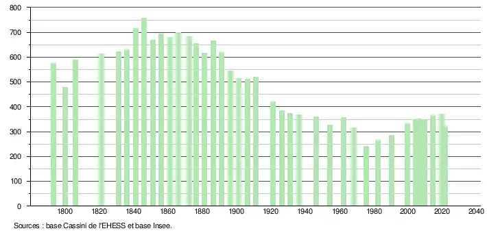 L'évolution du nombre d'habitants est connue à travers les recensements de la population effectués dans la commune depuis 1793. Pour les communes de moins de 10 000 habitants, une enquête de recensement portant sur toute la population est réalisée tous les cinq ans, les populations de référence des années intermédiaires étant quant à elles estimées par interpolation ou extrapolation[3]. Pour la commune, le premier recensement exhaustif entrant dans le cadre du nouveau dispositif a été réalisé en 2004[4].