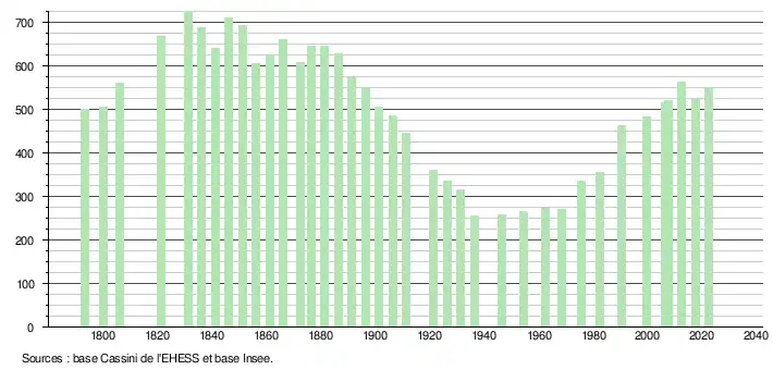 L'évolution du nombre d'habitants est connue à travers les recensements de la population effectués dans la commune depuis 1793. Pour les communes de moins de 10 000 habitants, une enquête de recensement portant sur toute la population est réalisée tous les cinq ans, les populations de référence des années intermédiaires étant quant à elles estimées par interpolation ou extrapolation[21]. Pour la commune, le premier recensement exhaustif entrant dans le cadre du nouveau dispositif a été réalisé en 2007[22].