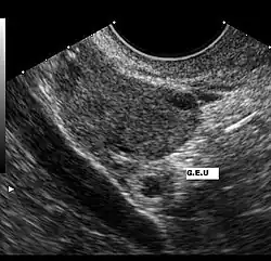 L'examen échographique peut être complété par l'utilisation d'une sonde endovaginale, permettant de mieux visualiser trompes, ovaires et contenu utérin et d'avoir une précision diagnostique plus importante[9].