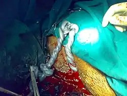 - les jumeaux en situation monoamniotique sont à risque d'accidents funiculaires lié à la présence, dans la même poche des eaux, de deux cordons ombilicaux qui peuvent s'enrouler et se faire des nœuds, accidents pouvant être à l'origine de morts in utero[2].