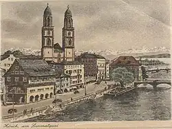 Le Grossmünster orné du drapeau du canton de Zurich.- Le Grossmünster et le Quaibrücke, depuis le lac de Zurich.