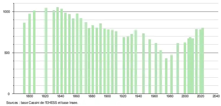 L'évolution du nombre d'habitants est connue à travers les recensements de la population effectués dans la commune depuis 1793. Pour les communes de moins de 10 000 habitants, une enquête de recensement portant sur toute la population est réalisée tous les cinq ans, les populations de référence des années intermédiaires étant quant à elles estimées par interpolation ou extrapolation[29]. Pour la commune, le premier recensement exhaustif entrant dans le cadre du nouveau dispositif a été réalisé en 2004[30].