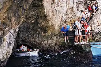 La grotte possède deux entrées : une sous-marine et une autre à un mètre seulement au-dessus du niveau de la mer (par mer calme) qui nécessite l’utilisation d'un petit bateau à rame en position allongée pour accéder à l'entrée.