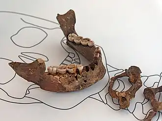 Les os retrouvés (une mâchoire complète, de nombreux restes du squelette post-crânien, des vertèbres, des côtes et plusieurs phalanges) ont été retrouvés recouverts d'un bloc de pierre gravé à côté d'un mur de grotte et entouré de petits feux de joie[5]. La datation au carbone 14 a donné aux restes un âge d'environ 18 500 ans[6].
