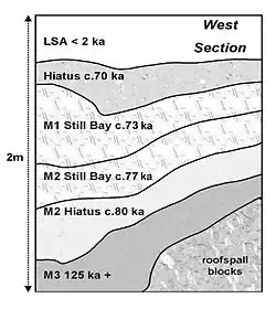 Les fouilles conduites sous la direction de C.S. Henshilwood depuis 1991 à Blombos ont permis d’éclairer d’un jour nouveau les modes de vie du Middle Stone Age[2]. Trois phases d’occupation ont été distinguées dans la séquence stratigraphique et nommées M1, M2 et M3. Des datations obtenues par OSL (Optically Stimulated Luminescence) et par thermoluminescence ont permis d’évaluer l’âge de la phase M1 à environ 73 000 ans (OIS 5a/4), celui de la phase M2 à environ 80 000 ans (OIS 5a) et celui de la phase M3 entre 100 et 140 000 ans (OIS 5d - 5e/6)[3],[4],[5],[6]. Le sommet de la séquence a livré des vestiges datant d'environ 2 000 ans BP et correspondant à des indices d'occupation du site par des groupes agro-pastoralistes du Later Stone Age (LSA)[7].