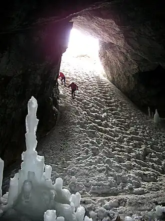 La longueur de la grotte peut être estimée à 100 m et sa température est proche de 0 °C.