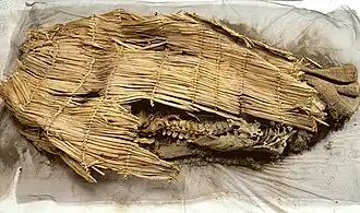 Il était chaussé de mocassins très travaillés, réalisés avec des morceaux de peaux de trois animaux. Le corps était enveloppé dans un linceul en peau de lapin et recouvert d'une natte de joncs.