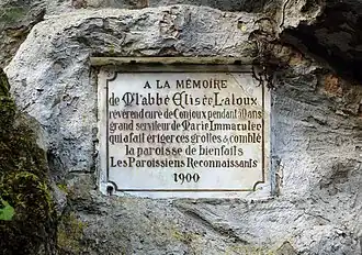 Au retour d’un pèlerinage à Lourdes, en France, l'abbé Elisée Laloux (1843-1900), curé de la paroisse de Conjoux à partir de 1870, eut à cœur de partager sa nouvelle dévotion mariale avec les fidèles de sa paroisse et autres habitants de la région. Il souhaitait offrir un lieu de pèlerinage à ceux qui n'avaient pas les moyens de se rendre à Lourdes même. À partir de 1880 il fit reproduire dans sa paroisse la grotte de Massabielle de Lourdes, où la Vierge Marie apparut à Bernadette Soubirous en 1858.