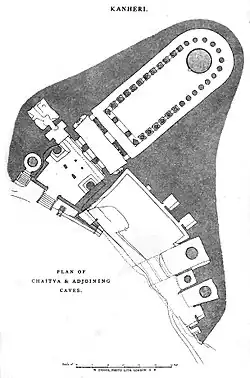 Ce temple mesure 30 mètres de long sur 15 mètres de large d'un mur à l'autre et comporte trente-quatre piliers autour de la nef et du dagoba, seulement 6 d'un côté et onze de l'autre. Les motifs des socles et chapiteaux du Chaitya de la grotte de Karli sont repris, mais pas aussi bien proportionnés ni aussi découpés avec autant de finesse, tandis que quinze piliers autour de l'abside sont des fûts octogonaux simples. Le dagoba est un dagoba très simple, mesurant près de 5 mètres de diamètre, mais son chapiteau est détruit ; il en va de même pour toutes les boiseries du toit voûté.