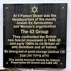 - ↑ Michelle Rosenberg, Former secret London HQ of Jewish anti-fascist group commemorated, article dans Jewish News le 14 février 2023. Page consultée le 25 février 2023.