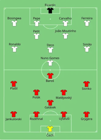 - 7 juin : la Suisse fait preuve de malchance, notamment avec la blessure au genou du meneur de jeu et meilleur buteur Alexander Frei pendant le match. Elle se crée pourtant plus d'occasions que son adversaire[1]. Malgré cela, la sélection tchèque marque un but décisif (71e) par son numéro 10, Václav Svěrkoš, qui venait de remplacer Jan Koller. La sélection helvète a eu d'autres possibilités dans ce match très serré, pour preuve le tir détourné par le poteau. Petr Čech réussit donc à garder ses cages inviolées. Suisse 0, Tchéquie 1.