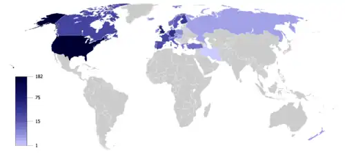 Carte des pays ayant eu, en 2009, le plus de personnalités politiques présentes aux réunions Bilderberg depuis leur lancement en 1954.