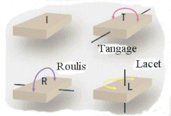 Dans la figure ci-contre, les trois retournements sont nommés d'après leur formulation aéronautique: roulis, tangage, lacet.