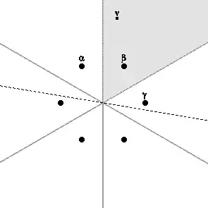 La base du système de racines qui respecte le choix de est l'ensemble des racines simples dans , i.e., les racines qui ne peuvent pas être écrites comme une somme de deux racines dans . Ainsi, les chambres de Weyl, l'ensemble et la base en déterminent un autre, et le groupe de Weyl agit simplement transitivement dans chaque cas. L'illustration suivante montre les six chambres de Weyl d'un système de racines , un choix de v, l'hyperplan (indiqué par une droite en pointillé) et les racines positives , , et . La base dans ce cas est (}.