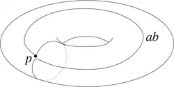 - Le groupe fondamental n'est pas toujours commutatif : par exemple, le groupe fondamental basé en un point p du plan privé de deux points ℝ2\{a, b}, est isomorphe au groupe libre à deux générateurs F2. Les deux générateurs sont ici des lacets partant de p et faisant chacun le tour d'un des points a ou b.