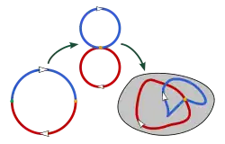 On souhaite donner une structure de groupe à cet ensemble π1(X, p). Si f et g sont deux lacets de X (basés en p), leur juxtaposition[7],[8] ou composition[9] est le lacet h appelé lacet composé[10] de f et de g ou lacet produit[11] fg, défini par :