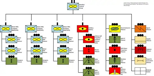 Un BTG est un groupement tactique composé le plus souvent d'un bataillon de fusiliers motorisés (de deux à quatre compagnies d'infanterie) complété par des détachements d'artillerie (de deux à trois batteries chacun de six obusiers lourds), antiaérien, du génie d'assaut, de transmission et de logistique[2]. Chaque BTG compterait de 600 à 800 militaires[3], ceux renforcés montant à 900[4].