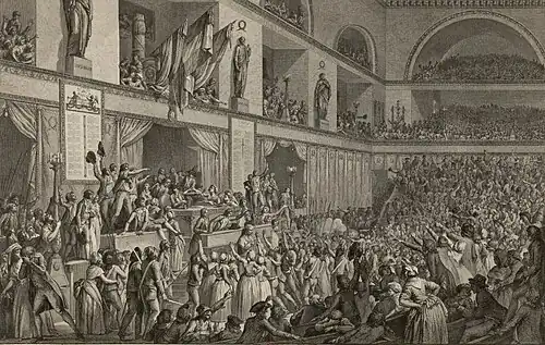 A droite, les royalistes (ou «crypto-royalistes»), vigoureusement opposés aux «anarchistes» (Jacobins) et au Directoire, ils sont favorables au retour de l'ordre par le rétablissement de la royauté. Soutenus depuis l'étranger par l'Agence de Paris[53] (liée au comte d'Artois), ils profitent de la tendance modérée du gouvernement et de la réaction thermidorienne pour diffuser prudemment leurs idées. Ils sont favorables aux émigrés et aux prêtres et se réunissent au sein du club de Clichy, où des monarchistes constitutionnels et absolus se rassemblent en vue des élections de 1797[52] qu'ils remportent avec succès dans de nombreux départements. En province, ils disposaient d'appuis locaux par la mise en place des «associations des amis de l'ordre»[54].