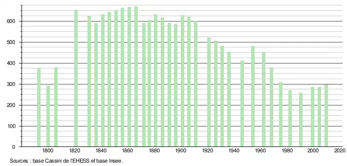 L'évolution du nombre d'habitants est connue à travers les recensements de la population effectués dans la commune depuis 1793. À partir du , les populations légales des communes sont publiées annuellement dans le cadre d'un recensement qui repose désormais sur une collecte d'information annuelle, concernant successivement tous les territoires communaux au cours d'une période de cinq ans. Pour les communes de moins de 10 000 habitants, une enquête de recensement portant sur toute la population est réalisée tous les cinq ans, les populations légales des années intermédiaires étant quant à elles estimées par interpolation ou extrapolation[12]. Pour la commune, le premier recensement exhaustif entrant dans le cadre du nouveau dispositif a été réalisé en 2004[13],[Note 1].