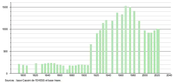 L'évolution du nombre d'habitants est connue à travers les recensements de la population effectués dans la commune depuis 1793. Pour les communes de moins de 10 000 habitants, une enquête de recensement portant sur toute la population est réalisée tous les cinq ans, les populations de référence des années intermédiaires étant quant à elles estimées par interpolation ou extrapolation[17]. Pour la commune, le premier recensement exhaustif entrant dans le cadre du nouveau dispositif a été réalisé en 2005[18].